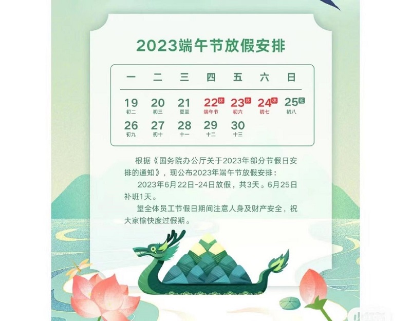 根據(jù)2023年端午節(jié)放假通知精神,放假具體安排通知如下:6月22日至6月24日放假共3天,不調(diào)休。