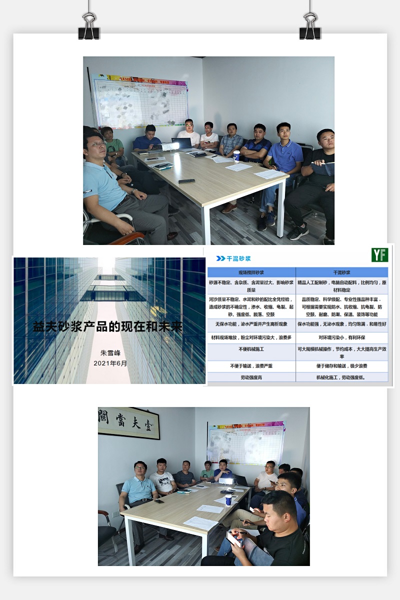 7月14日下午銷售部每周例會結束后,又請實驗室朱主任為銷售部進行產(chǎn)品知識培訓。此次朱主任特意準備了35頁的精美PPT,培訓主題是“益夫砂漿產(chǎn)品的現(xiàn)在和未來”,內(nèi)容包括對公司現(xiàn)有產(chǎn)品的成分、性能、施工工藝、產(chǎn)品之間優(yōu)劣勢對比、現(xiàn)場常見產(chǎn)品問題的展示并給出解決方案、對市面上新型產(chǎn)品進行分析、對公司未來的產(chǎn)品發(fā)展指出方向。PPT內(nèi)容附上現(xiàn)場圖片和施工視頻,圖文結合,直觀易懂。從2020年起,砂漿的規(guī)格型號就發(fā)生了改變,朱主任在培訓時針對型號的變化做出解釋,這方便業(yè)務員日后與工地進行說明。培訓結束后,大家熱烈鼓掌,對朱主任細致全面的培訓表示感謝,并表示此類培訓以后能夠多多開展。